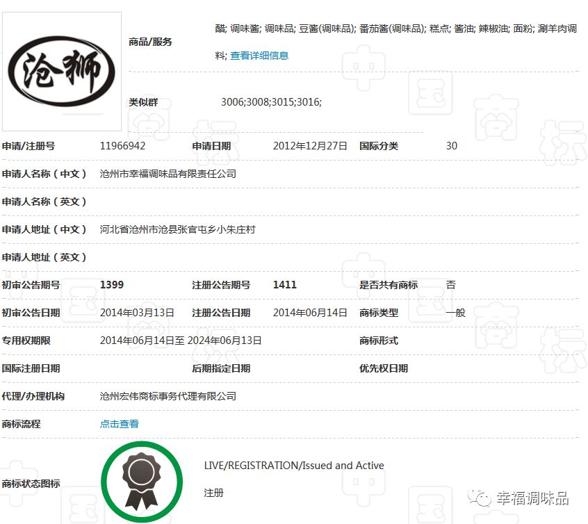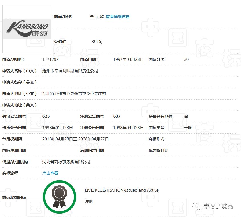 幸福調(diào)味品自創(chuàng)辦30多年以來,在工商部門指導(dǎo)下,充分認(rèn)識(shí)到商標(biāo)品牌的重要性,始終堅(jiān)持走創(chuàng)品牌的路子。公司的“康頌”商標(biāo)于1997年在30類,糖、茶、糕點(diǎn)、調(diào)味品類獲核準(zhǔn)注冊(cè)后,并根據(jù)市場(chǎng)需要,先后又注冊(cè)了包括“滄獅”中文及拼音在內(nèi)的等商標(biāo);形成了涵蓋多類別、多商品、多層次的商標(biāo)品牌庫(kù)。
